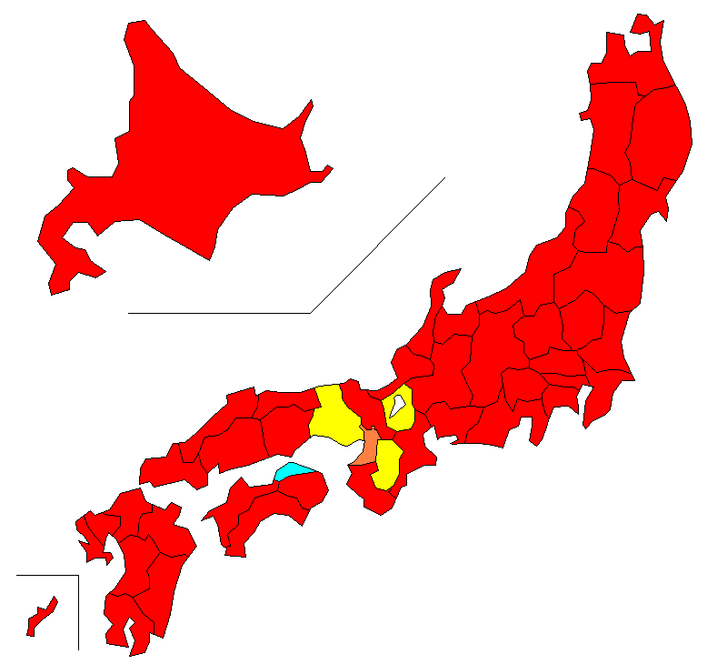 2026年衆院選〜自民圧勝、中道惨敗 赤■1位自民、2位中道 水■1位自民、2位国民 黄■1位自民、2位維新 橙■1位維新、2位自民 |